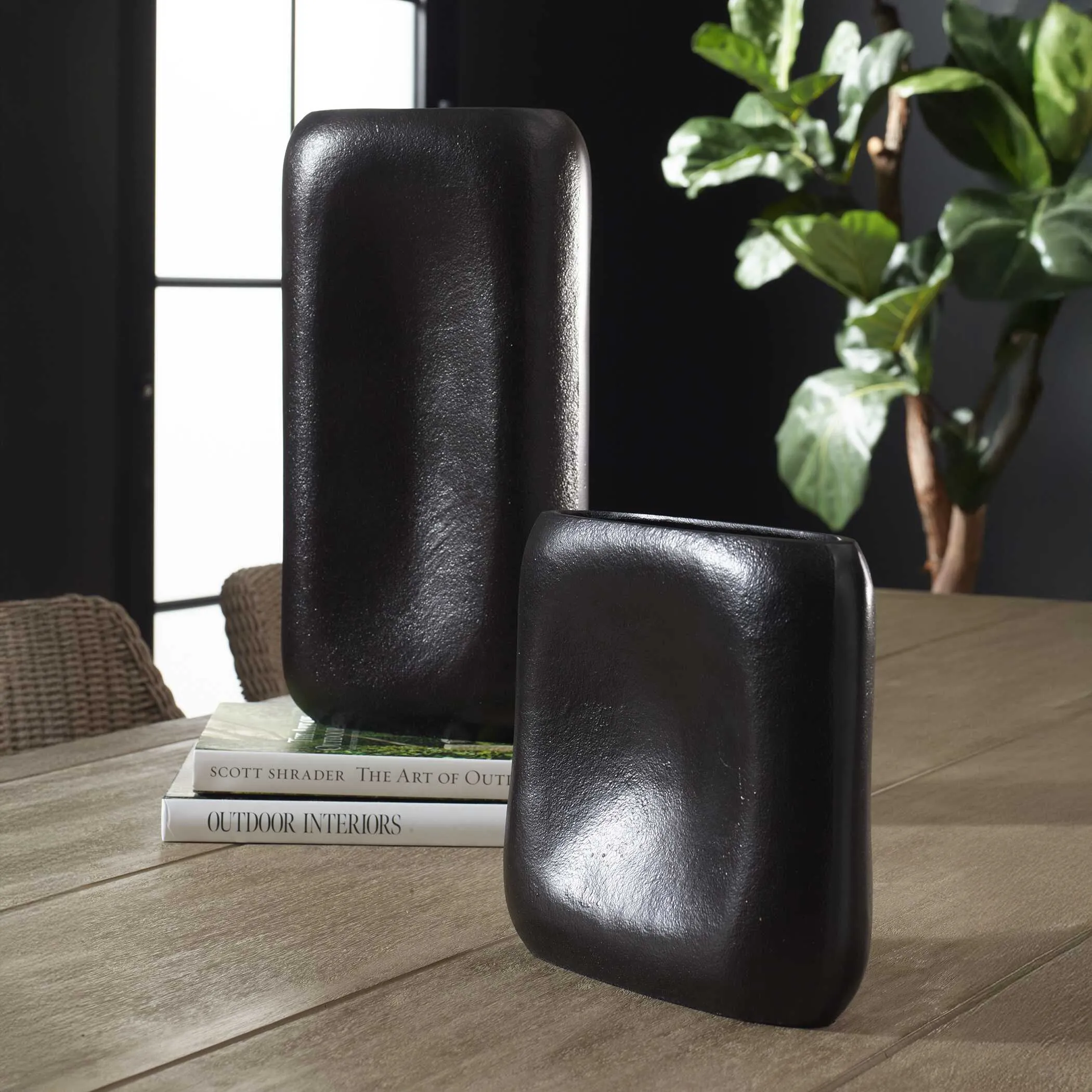 Crafted From Aluminum And Finished In Deep Brown, This Set Of Two Vases Features A Unique Blend Of Modern Geometry And Soft, Organic Curves. Display Empty Or With A Fresh Arrangement. Sizes: S-11x10x3, L-9x17x4