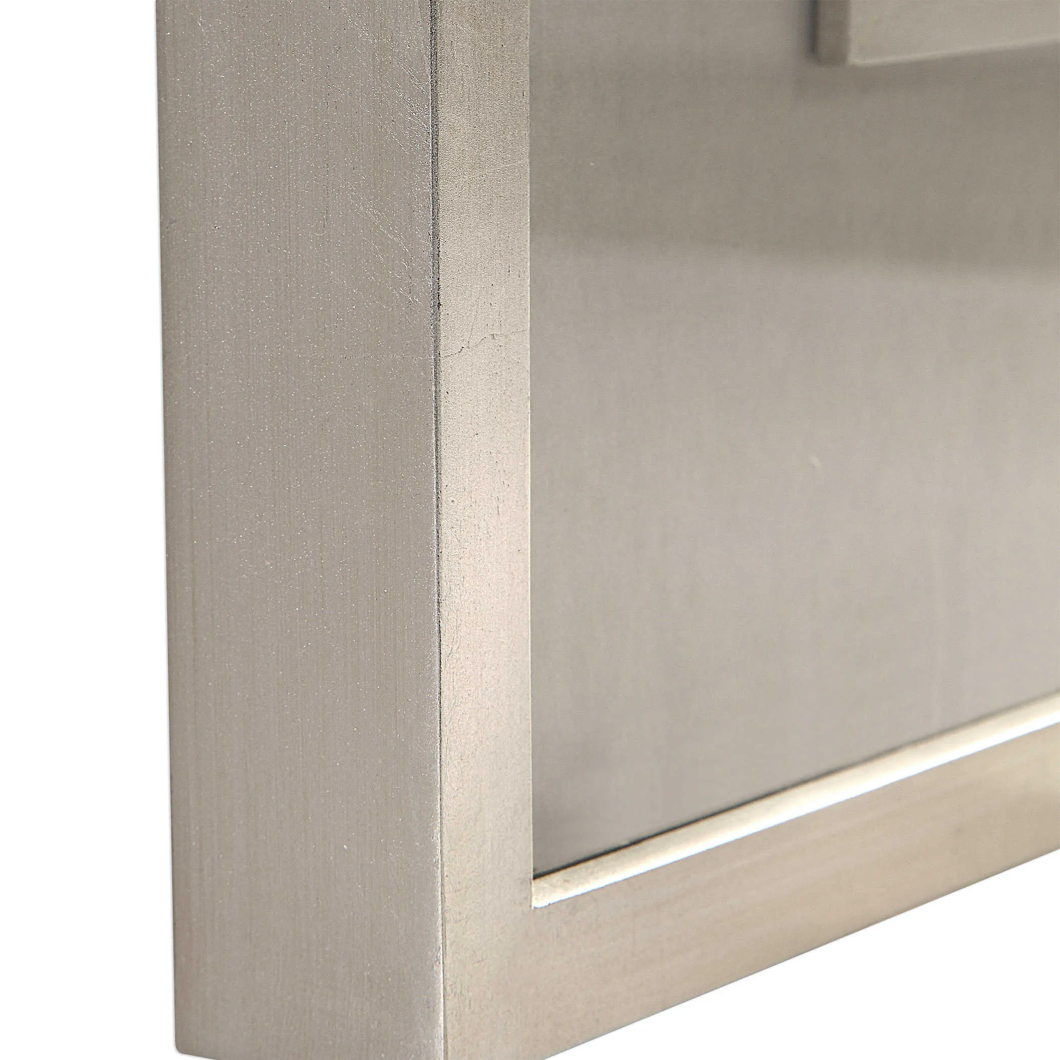 A unique, minimalist design is featured in these abstract art prints. Earthy neutral tones of warm gray, charcoal, and off-white are complimented by warm gray mats. Bright silver leaf frames and fillets complete these contemporary works of art. Each print is placed under protective glass.