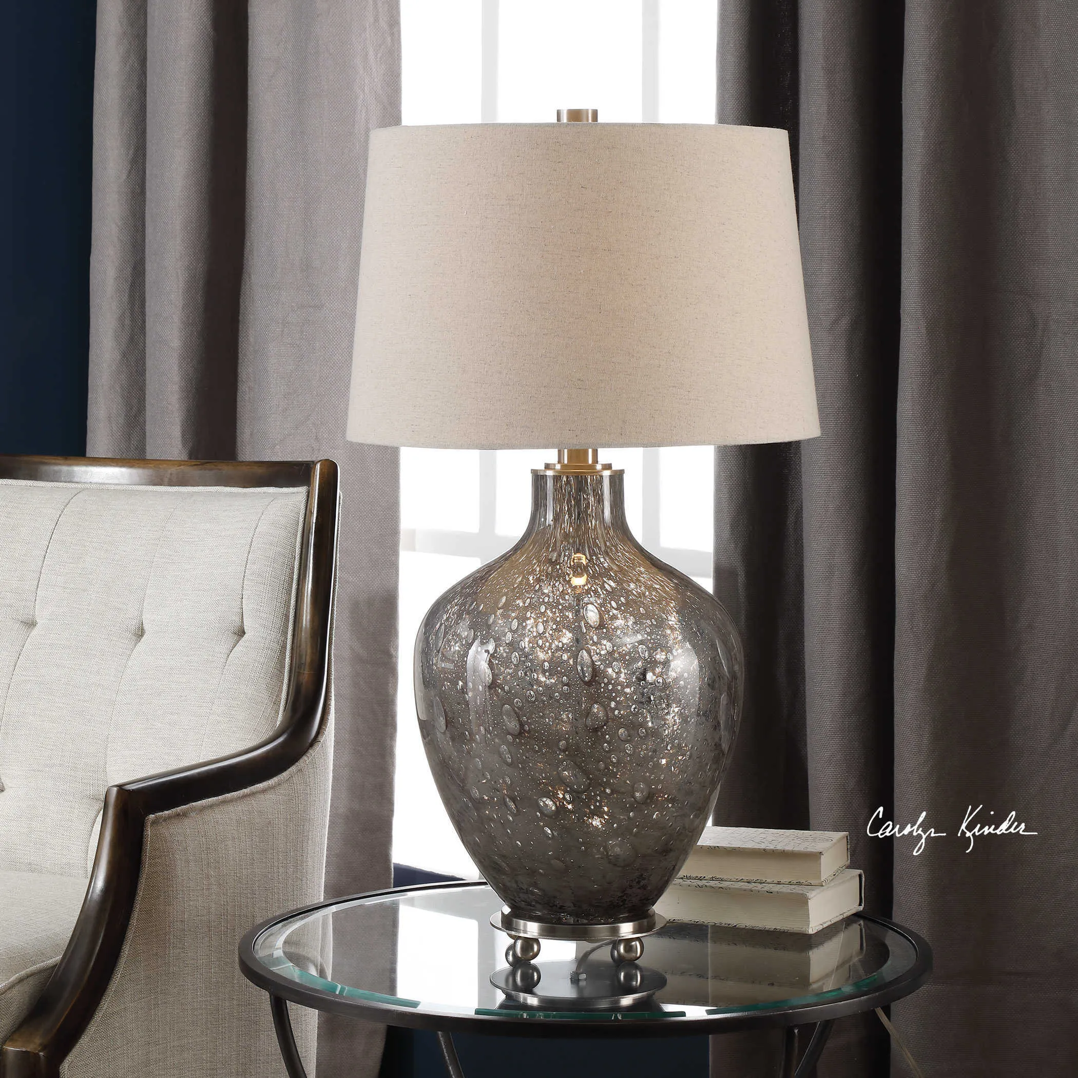 Heavily seeded transparent gray glass, accented with brushed nickel plated details. The tapered round hardback shade is an oatmeal linen fabric with natural slubbing.