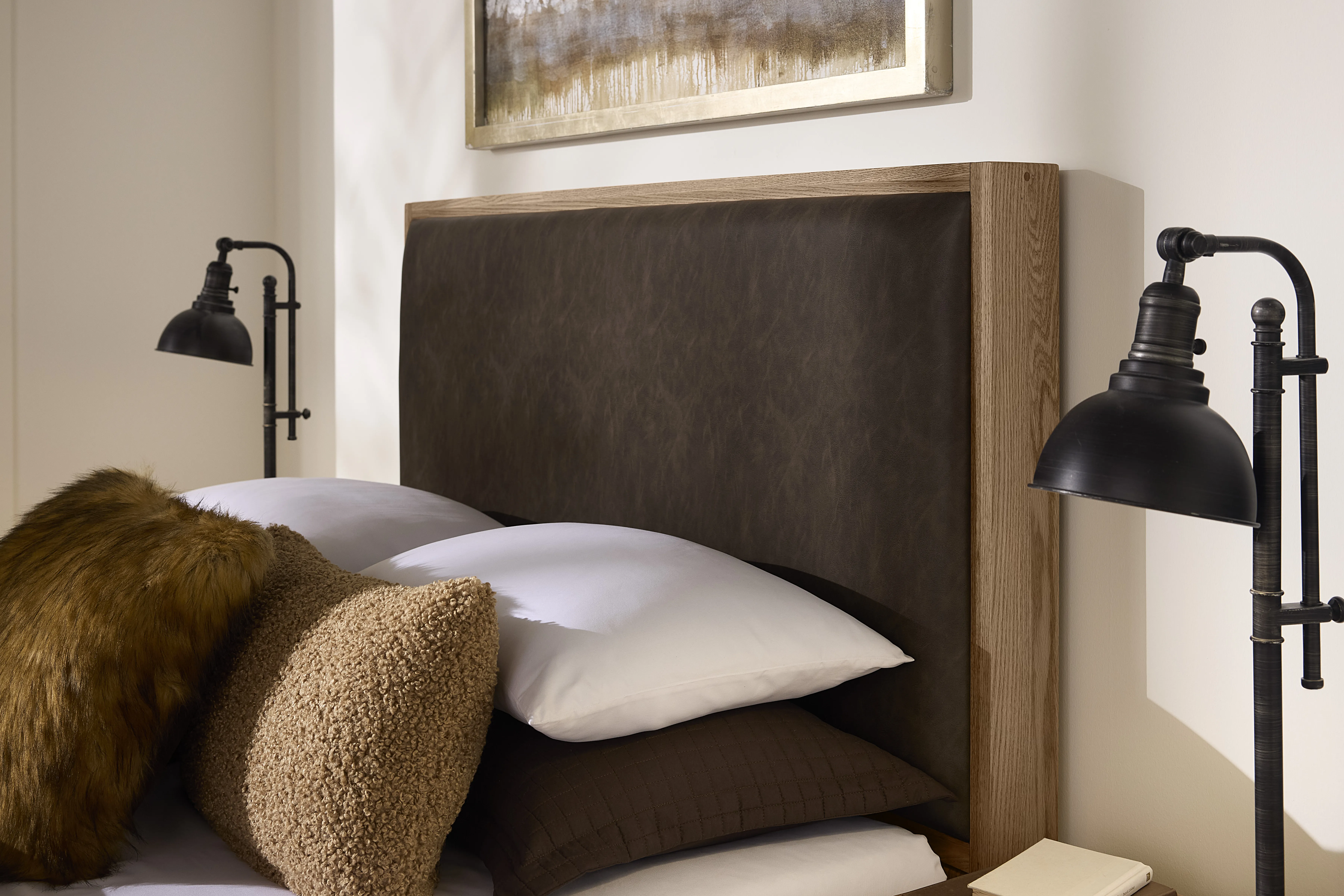 Wood Trim Upholstered Bed offers a tailored; contemporary appeal. Features an upholstered headboard with oak wood trim covered in Sedona Brown Vegan Leather fabric. Super soft and durable enough to withstand the wear and tear of everyday life.