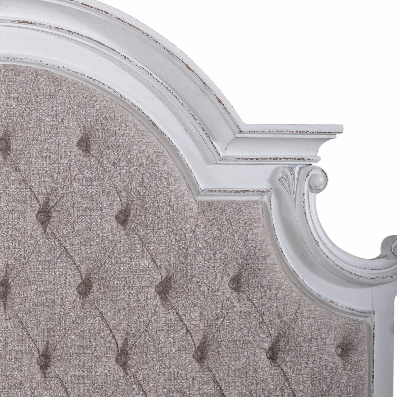Grand scale, the warm antique finishes and artistic distressing make this an item to pass along for generations. Features tufted chenille fabric with fluted style post. Headboard can stand alone with Hollywood frame. Pair with the footboard, canopy, and rails for a complete bed.