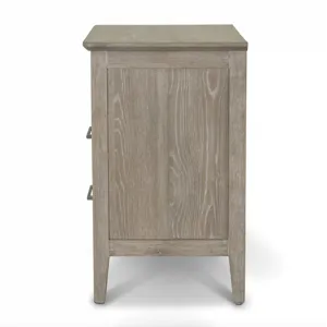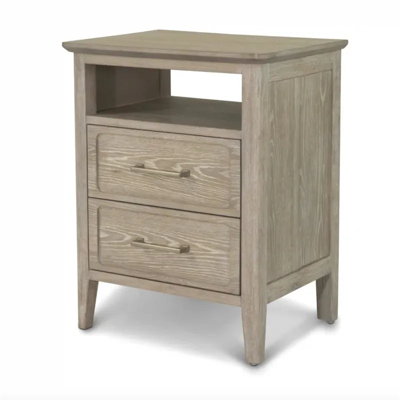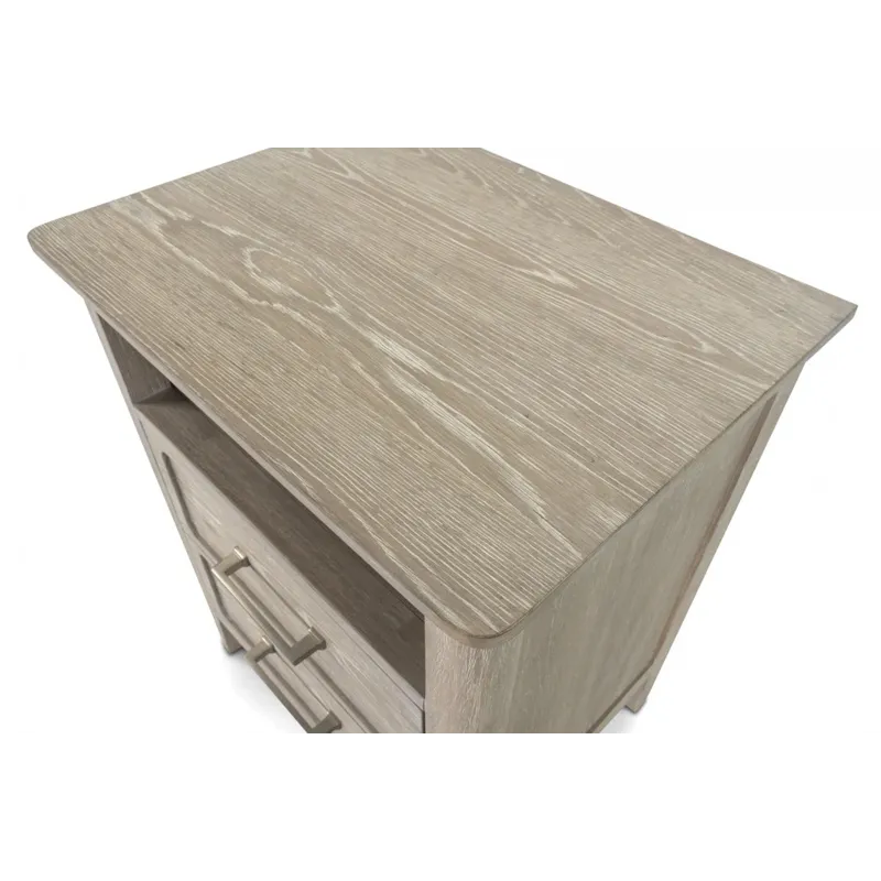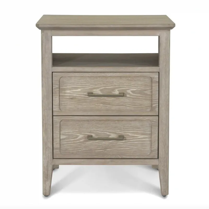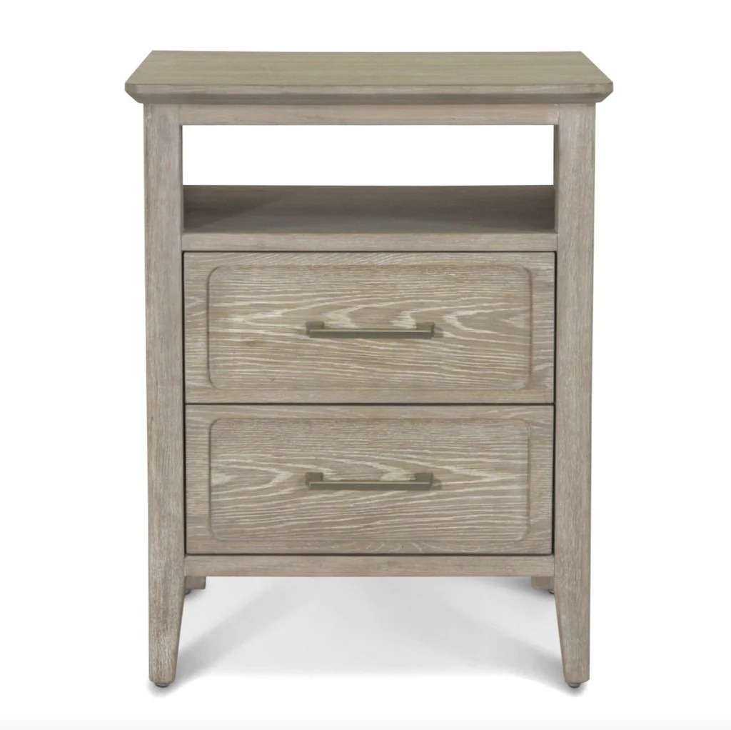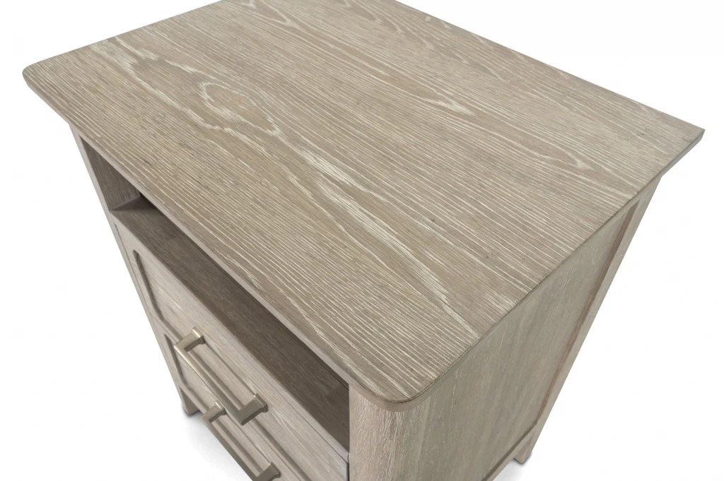 Cases are White Oak with a Cathedral Cut in a wire brushed driftwood finish and slight cerusing. Drawer fronts are expertly routered out to give depth. Hardware has a gradual stepped design with pewter finish, tapered legs finish case. Nightstand has USB/USBC.