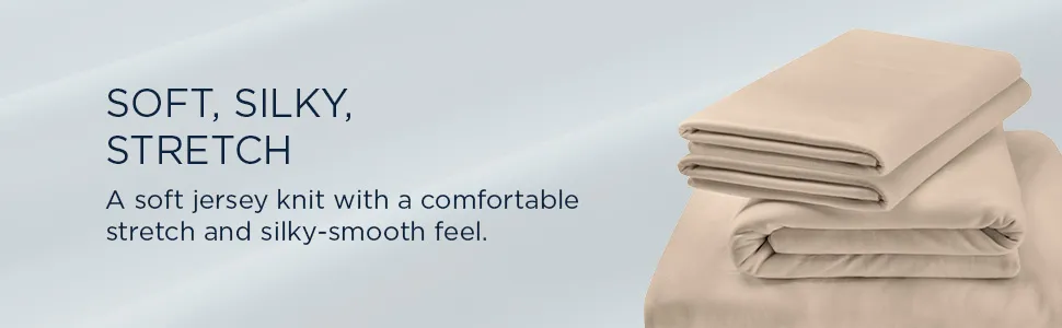 Soft, silky stretch. These 100% rayon from bamboo sheets feature a soft jersey knit with a comfortable stretch and natural moisture-wicking qualities. It all adds up to a silky-smooth feel—and thanks to our unique StayTight™ bands for a snug, secure fit, the fitted sheets will stay in place perfectly on your mattress- no bunching, no creeping corners and no readjusting needed Available in White, Sandstone, Sleepy Blue, Cool Gray, and Vintage Indigo.