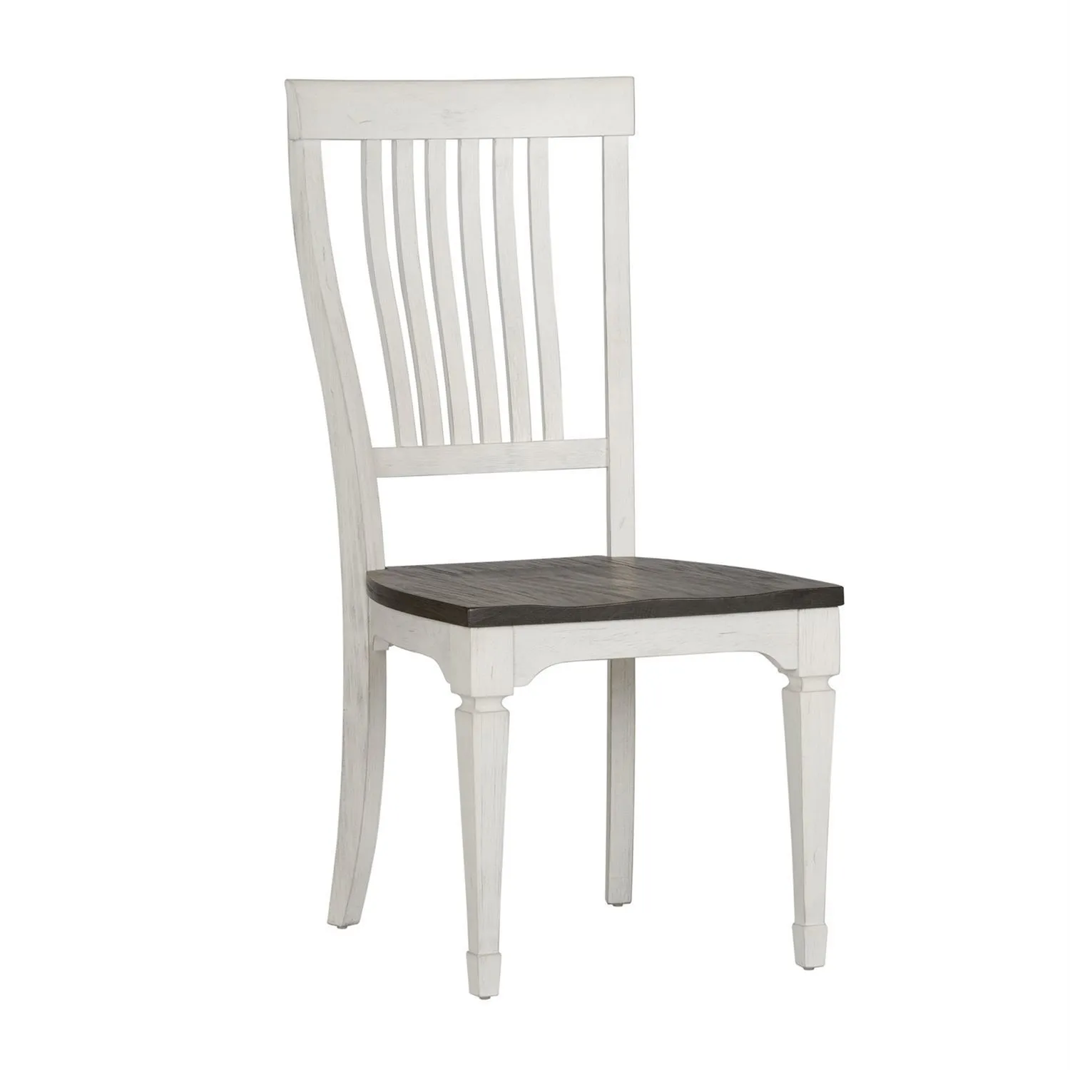 Allyson Park Slat Back Side Chair (RTA) x 4: Sit in comfort and style with the Allyson Park slat back side chair. Crafted of poplar and rubberwood solids, this piece features a wire brushed white finish with a charcoal seat, nylon chair glides to protect your flooring, curved wooden seat for added comfort, a slat back, and is anchored by square tapered legs. This chair is perfect for creating a classic look while maintaining a casual feel.