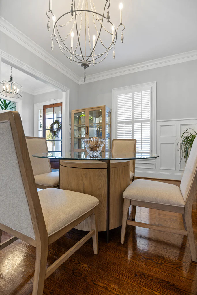 Round table in a White Oak with a cathedral cut with muted tones and a clay finish. Hardware features a powder coated bar hardware fitted into a split dowel. Full powder coasted bronze metal X frame with a floating 54" round top. Levelers on all feet and top.