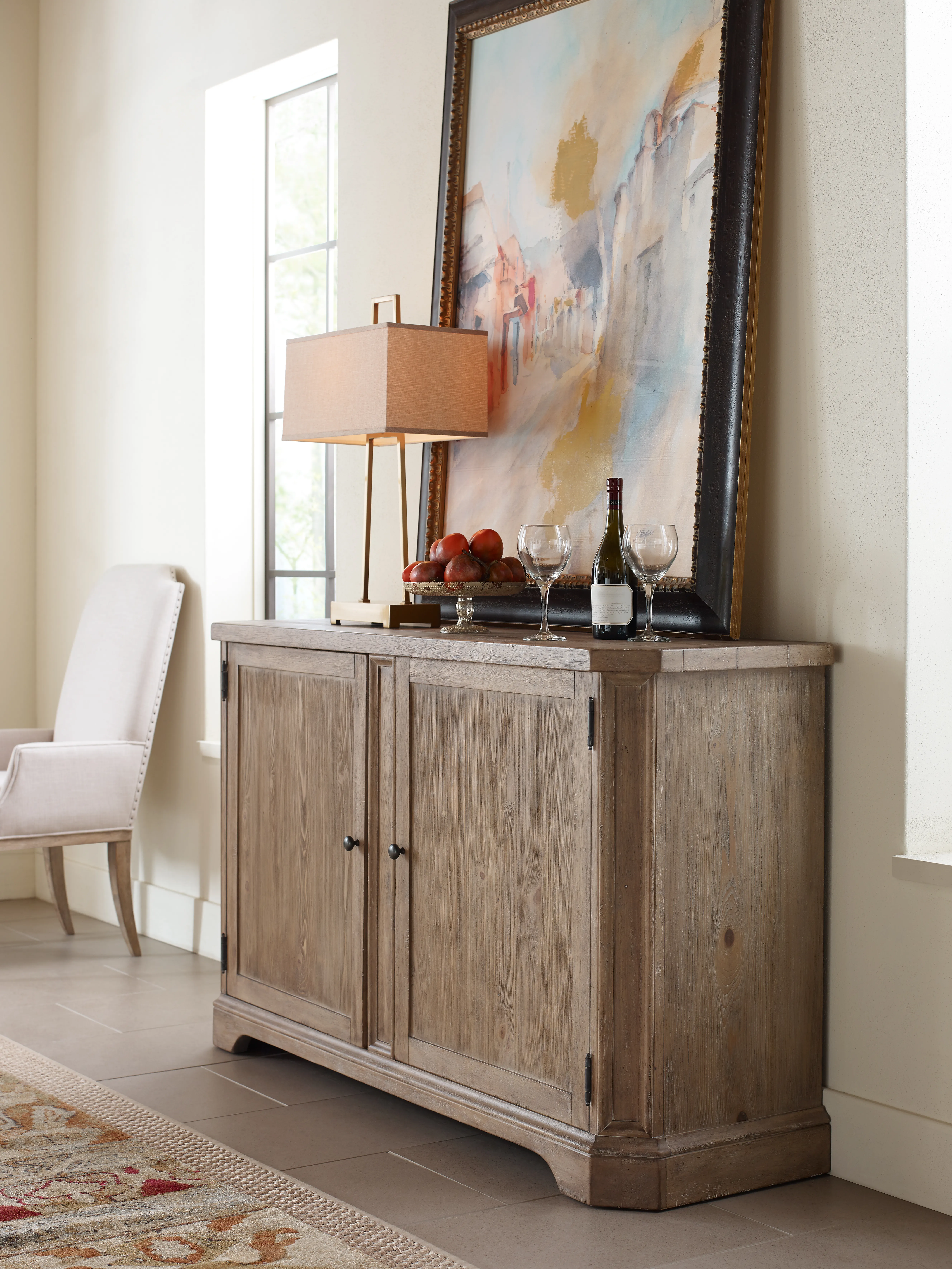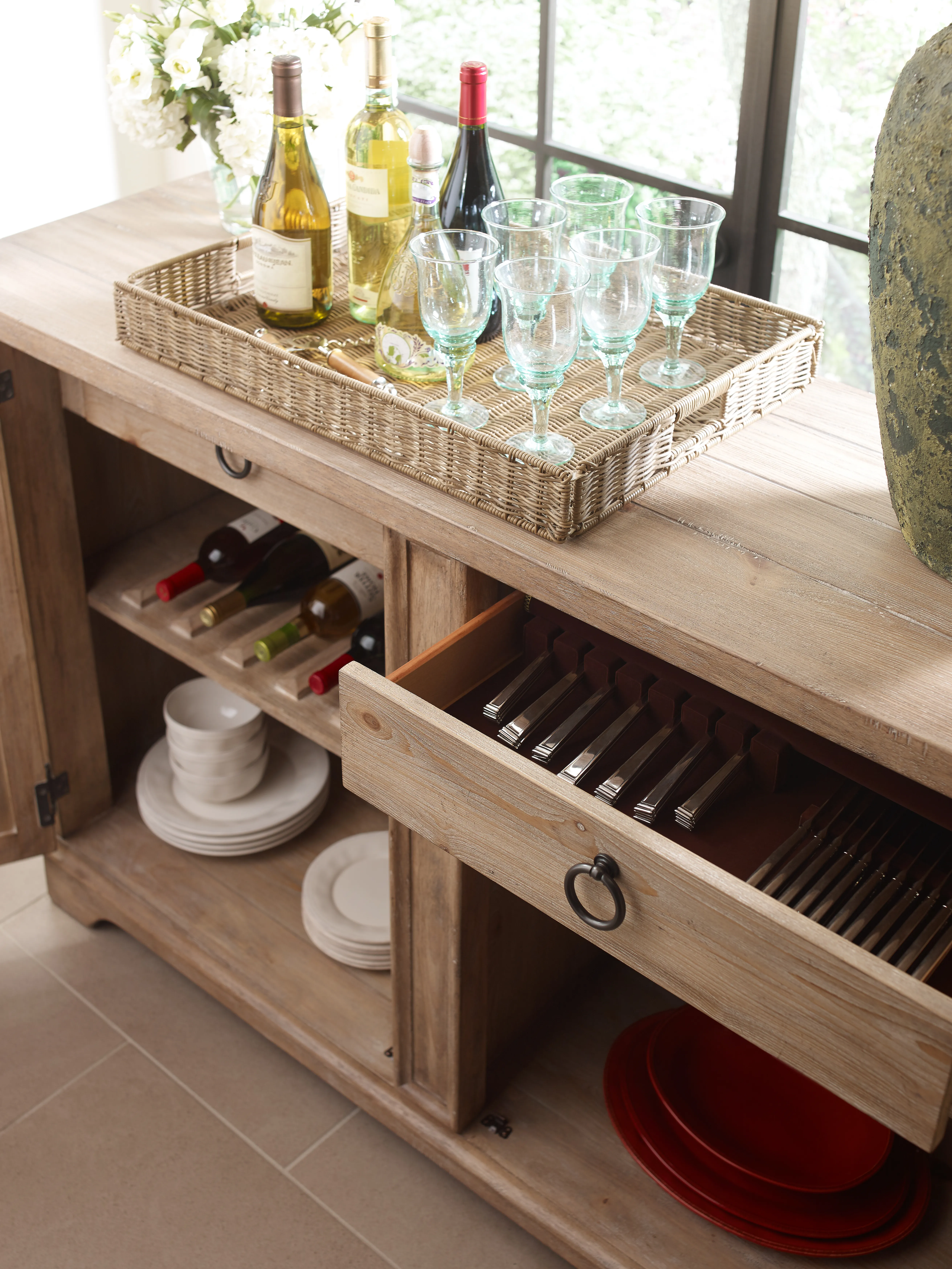 Featuring 2 doors with 2 reversible, adjustable wine bottle shelves. 2 interior drawers are the perfect place to house your cutlery and table linens. Forged Nero finished metal door knobs and ring drawer pulls create a timeworn, handmade feel. This new addition into the Rachael Ray Home collections is based on Rachael’s love of and special connection to an area in Italy, known as Monteverdi. This rustic casual collection features Pine solids with Knotty Cypress Veneer in a Sun-Bleached Cypress finish with distressing & wire brushing.