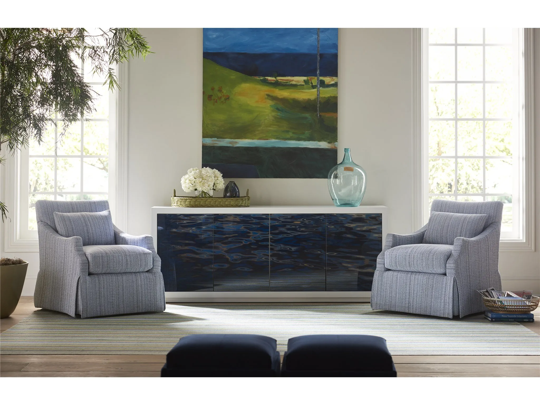 Invite a stylish repose to spaces with the skirted Margaux Accent Chair, a charming furnishing designed with a petite silhouette and lightly striped blue upholstery. For added convenience, it also features swivel functionality.