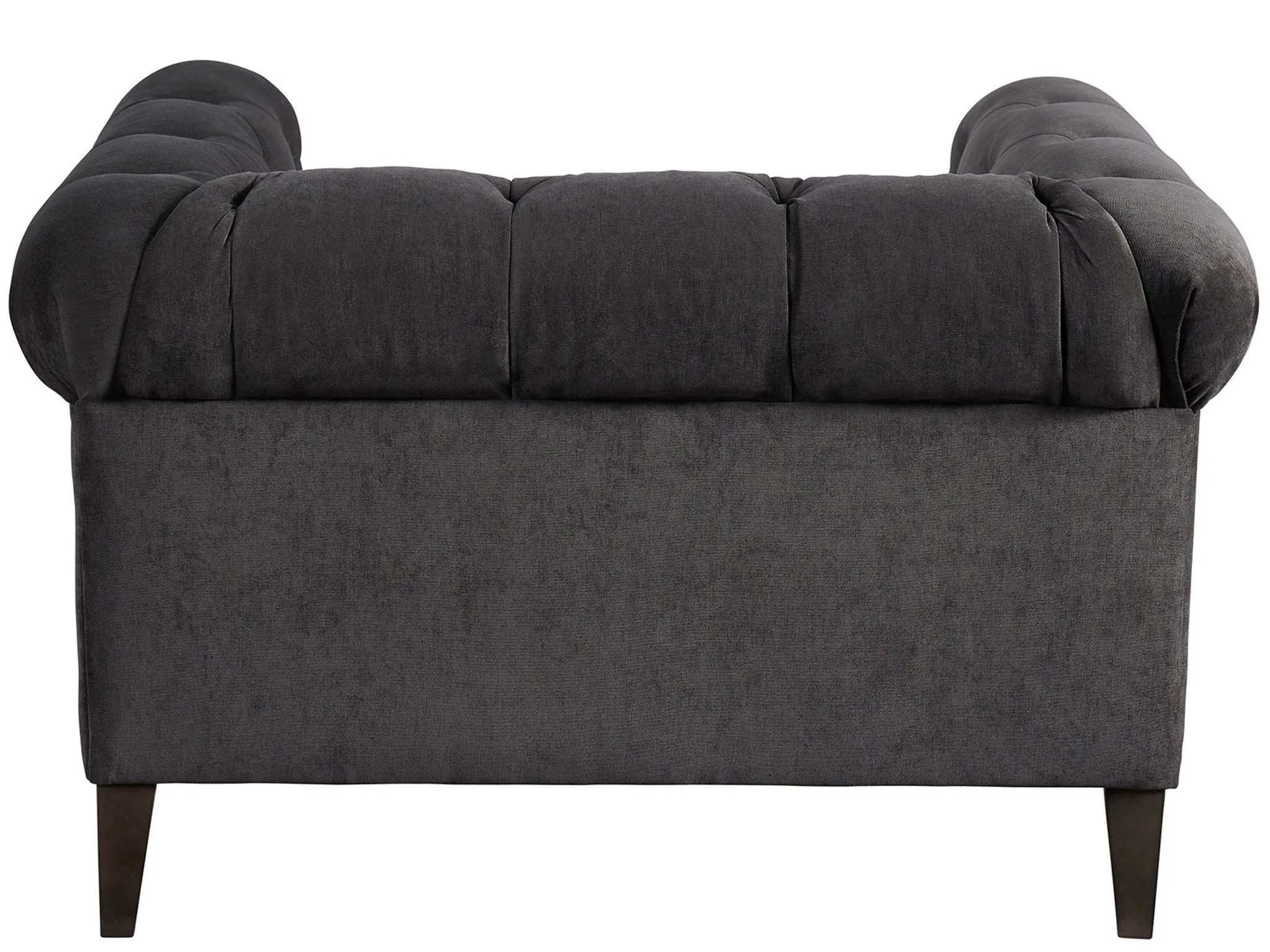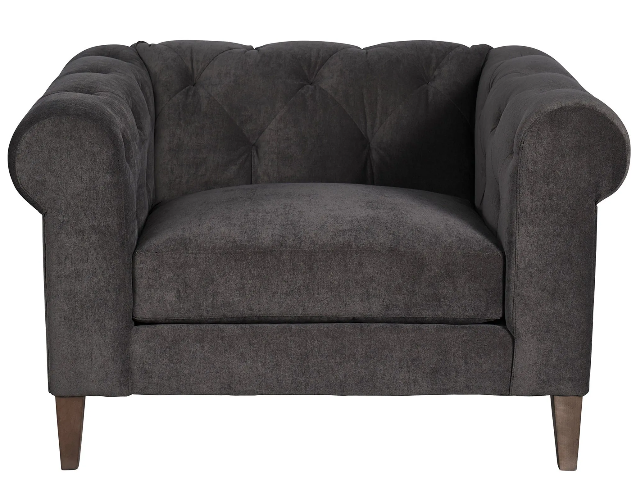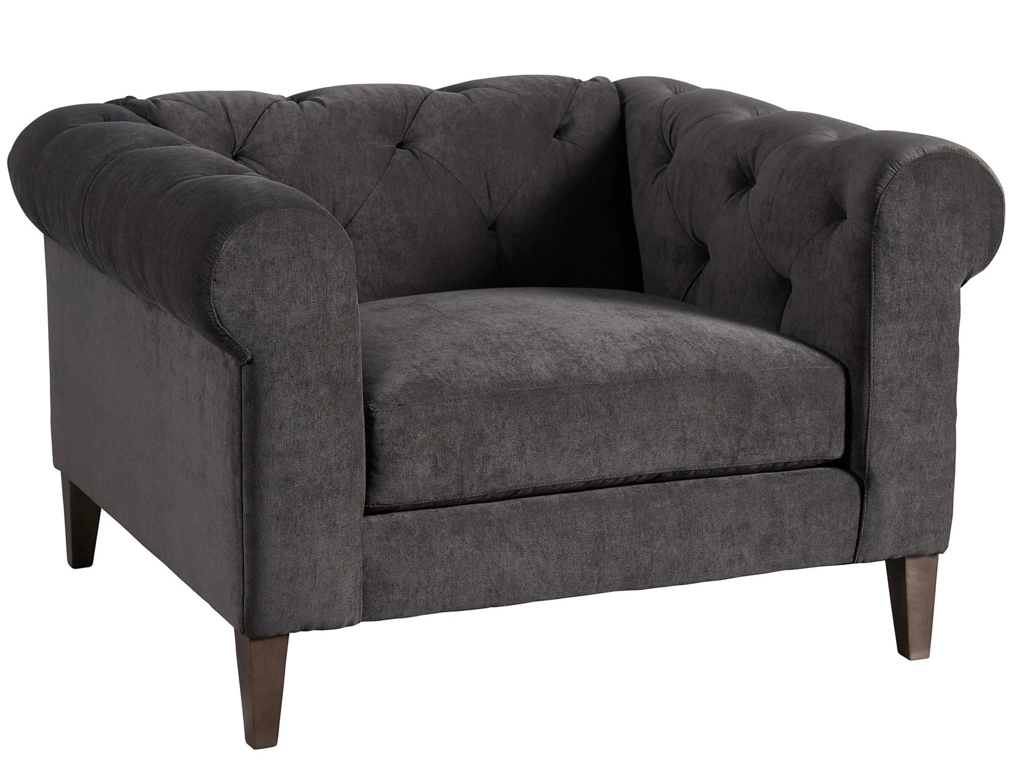 Regal and commanding of attention, the Hugh Chair boasts an inviting upholstered body, elegantly rolled armrests, and button-tufting details for added richness and depth.