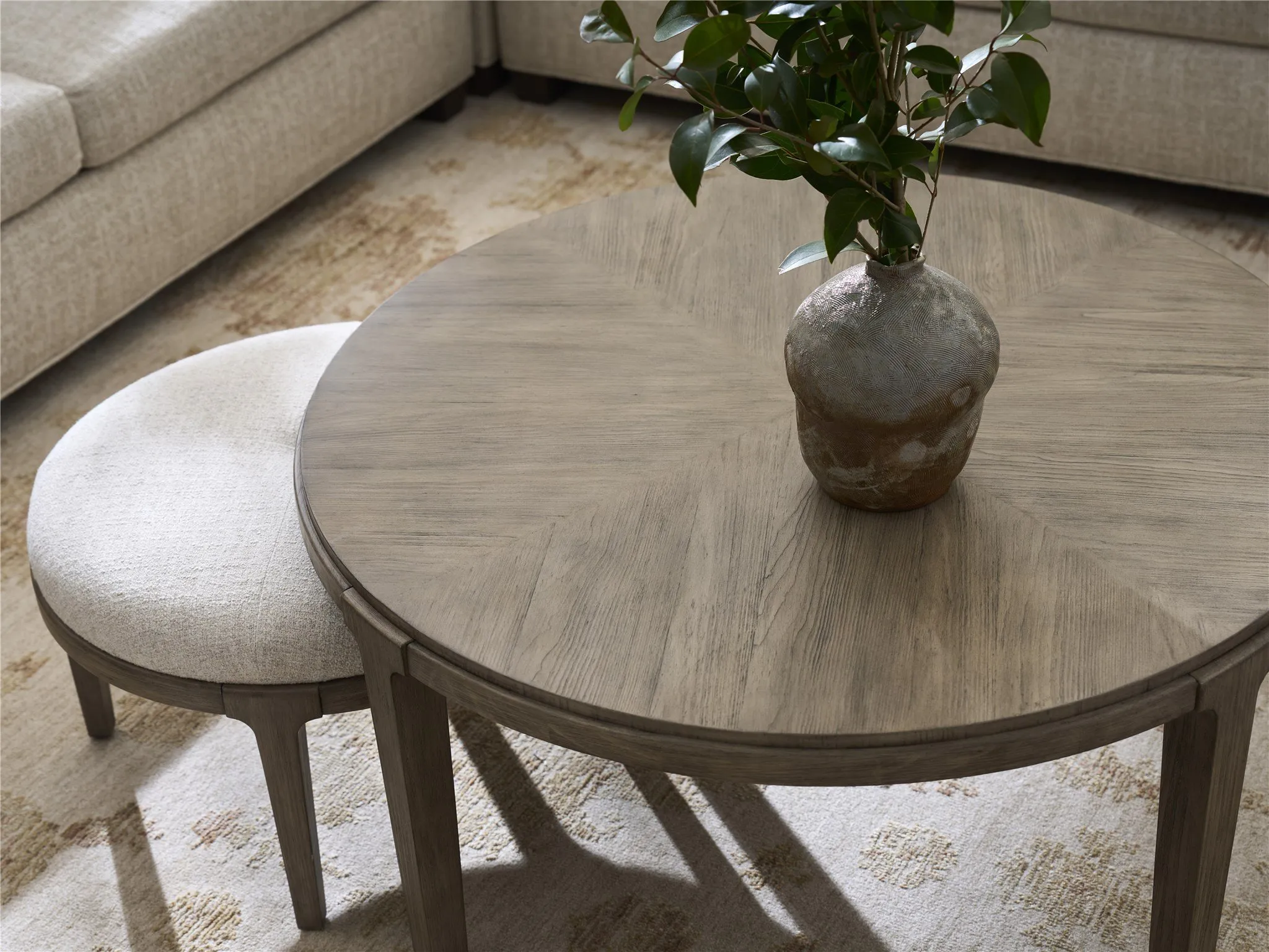 The Boulder Bunching Cocktail Table offers versatile style with its nesting design. Finished in a warm Boulder medium-brown, the round table top features a subtle radial pattern, while the upholstered pouf tucks neatly underneath, providing extra seating or a surface for display. This set brings a blend of functionality and refined elegance to your living space, perfect for flexible arrangements and effortless entertaining.