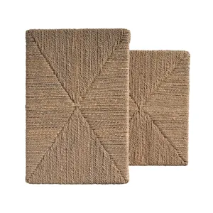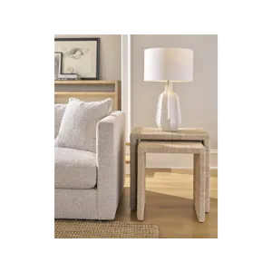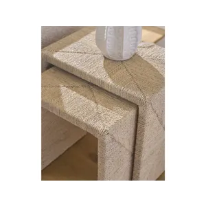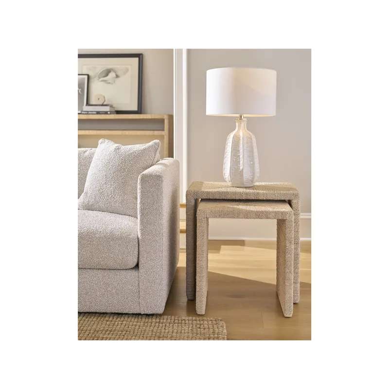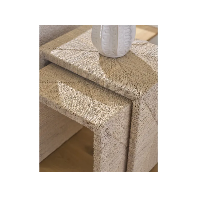 The Abaca Nesting Tables are wrapped in natural abaca fiber, including a 24-inch large table and 19-inch small table for versatile use. These organic tables create flexible surfaces that can be arranged together or separately throughout your coastal living space.