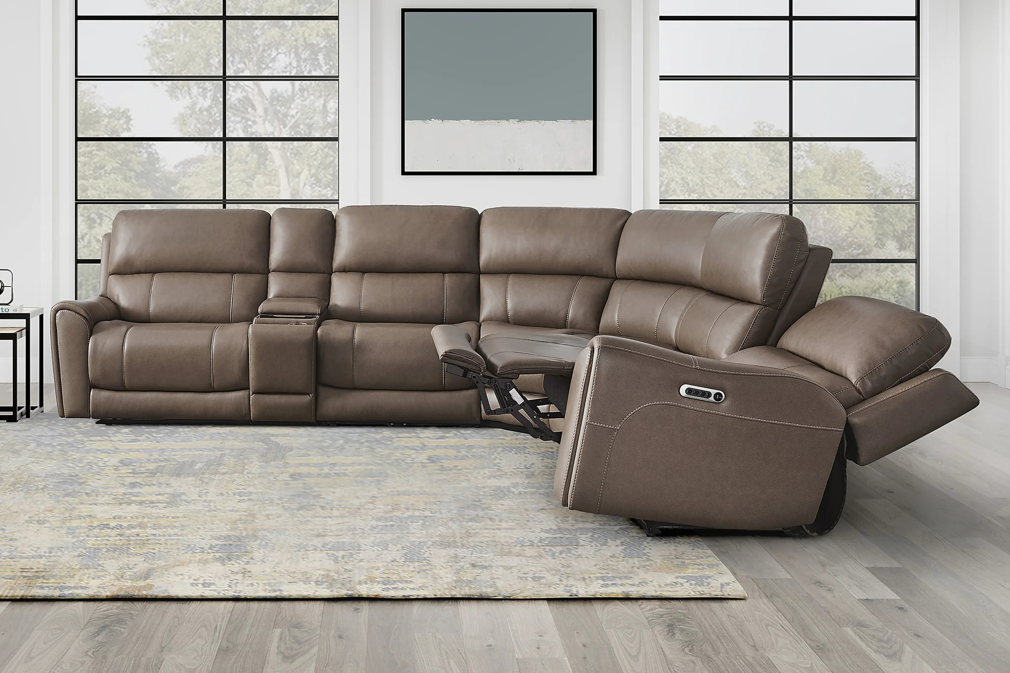 6pc Modular Width Depth  Height  123 in. 135 in. 42 in. Individual Pieces Width Depth  Height Power Zero Gravity Left Arm Facing Recliner 40 in. 41.5 in. 42 in. Tilt Console w/ Wireless Charger 12 in. 42 in. 42 in. Power Zero Gravity Armless Recliner 31 in. 41.5 in. 42 in. Corner Wedge 72 in. 52 in. 42 in. Armless Chair 31 in. 41.5 in. 42 in. Power Zero Gravity Right Arm Facing Recliner 40 in. 41.5 in. 42 in.