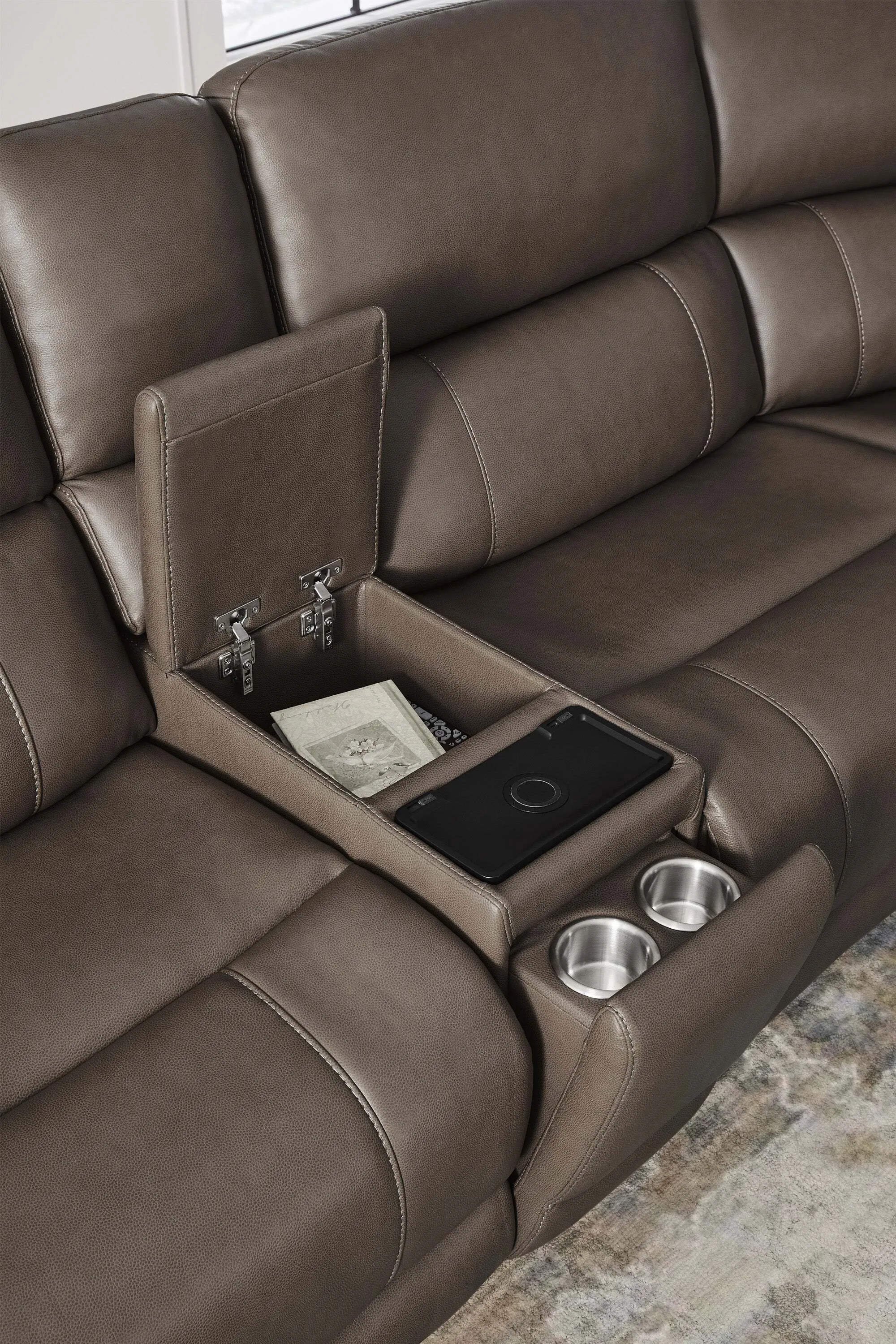 - Tilt console with hidden stainless steel cupholders, lift-top storage, pop-up magnetic wireless outlet and 1 USB port and 1 USB-C port