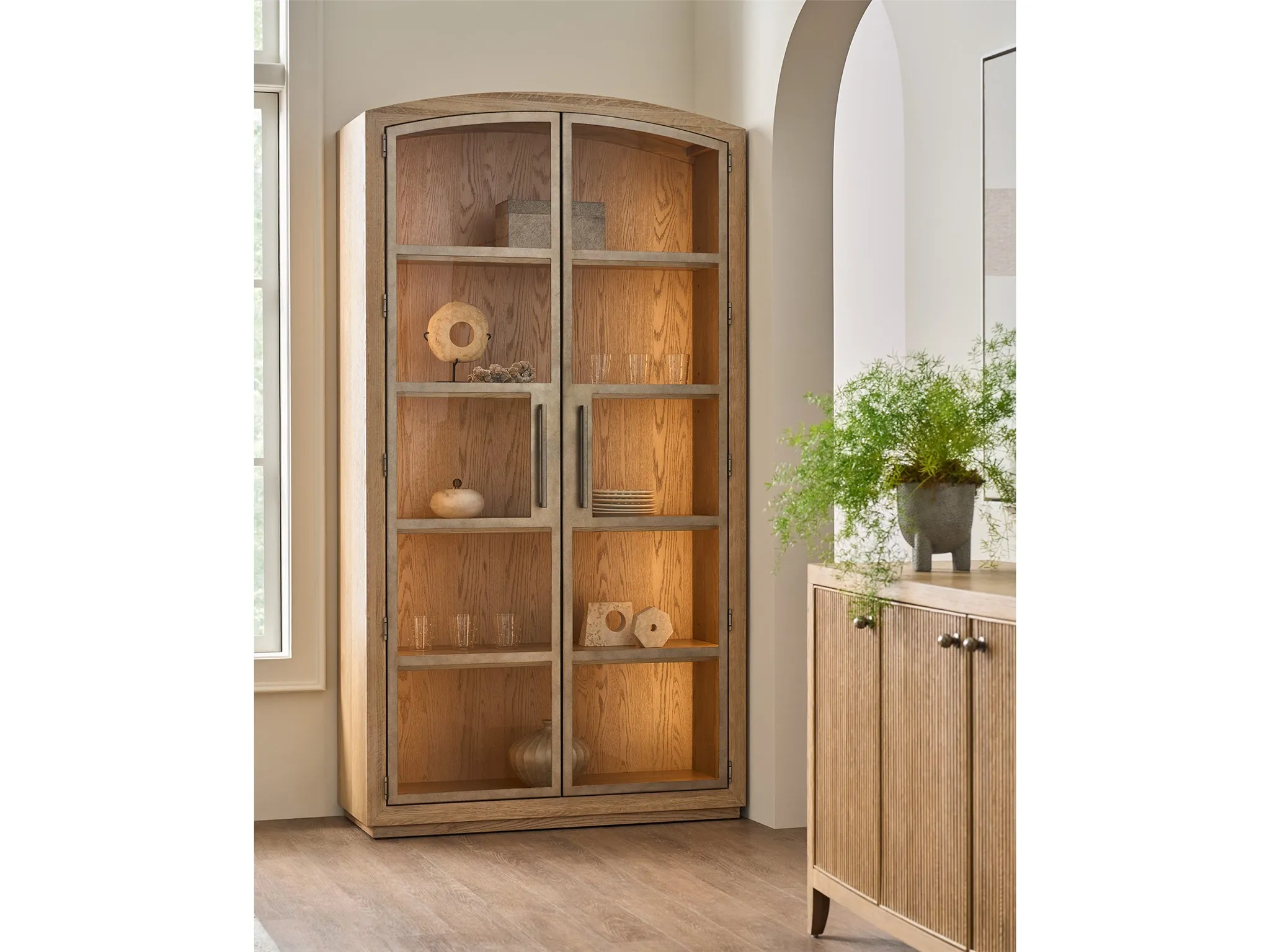 The Scribe Cabinet is a stunning piece of modern furniture. Its sleek, rounded top and minimalist silhouette create a refined aesthetic. The combination of metal doors and a wood case, illuminated by an LED light strip, adds a touch of industrial chic. The three adjustable shelves and one fixed wood shelf offer ample storage space for books, collectibles, or other cherished items.