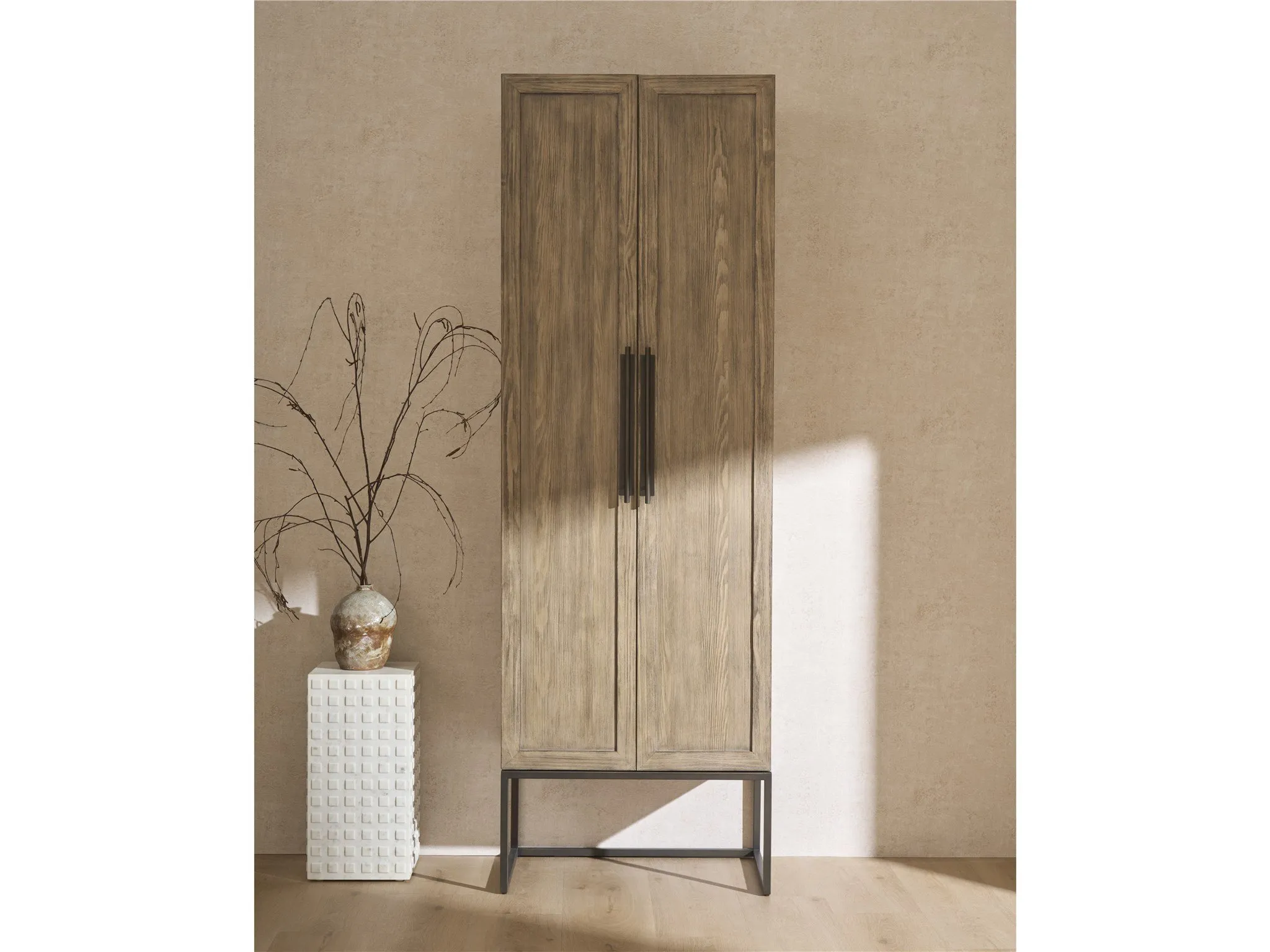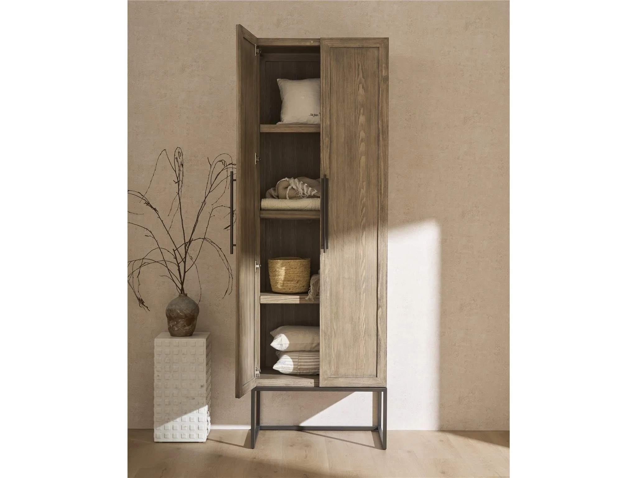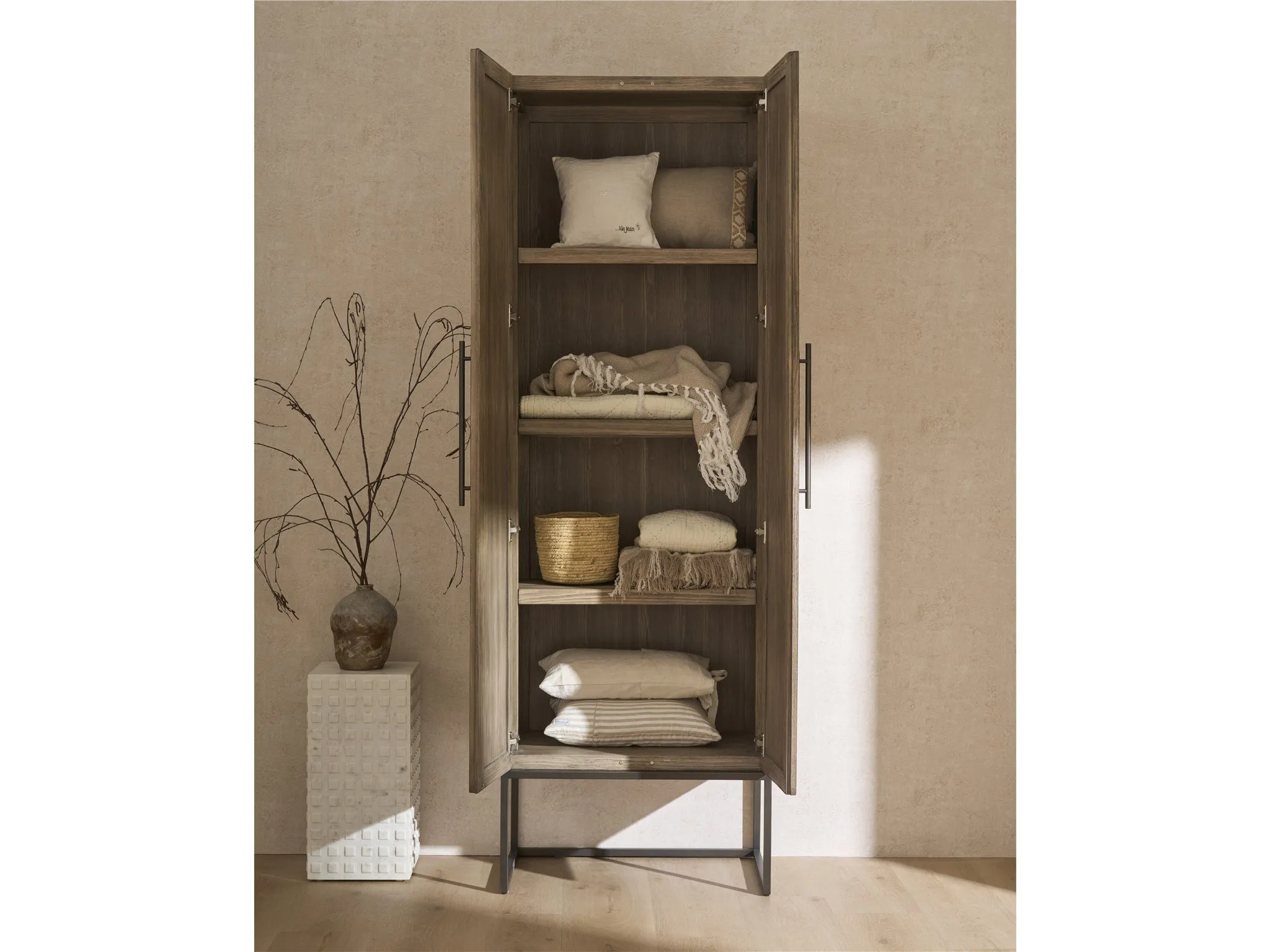 Showcasing a warm Boulder medium-brown finish, the Utility Cabinet brings refined storage to any room. Its sleek metal base elevates adjustable wood shelves, accented with inset glass, offering a blend of modern design and practical display. This piece adds a touch of architectural sophistication, making it a versatile and stylish addition to your home.
