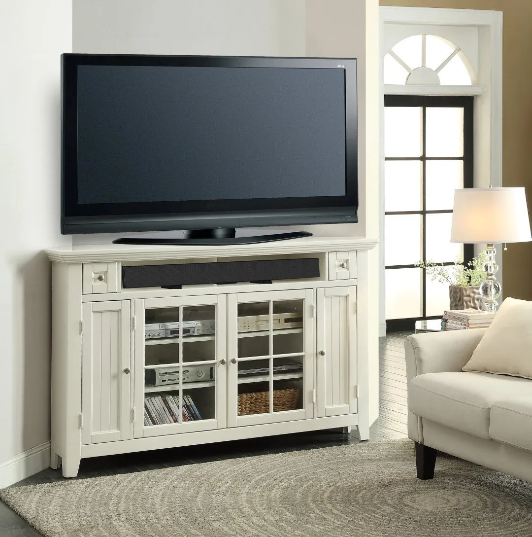 From the first moment you see it, the 62-inch Corner Tall TV Console from the Tidewater collection is destined to become a must-have. Perfect for displaying your media and electronics, it features glass doors, ventilation, cord management, and a sound bar opening. Its fresh Vintage White finish conveys endless charm while feeling at-home in any space.62 in.16.75 in.40.13 in.Vintage WhitePoplar Solids / Birch VeneersMulti-step long lasting finishLevelers included to easily level and align your furnitureSlots in Backpanel designed for ventilation and Cord ManagementAdjustable wood shelves for design flexibilityGlass door(s) enable media remote functionalitySoundbar opening designed to accommodate the latest technology