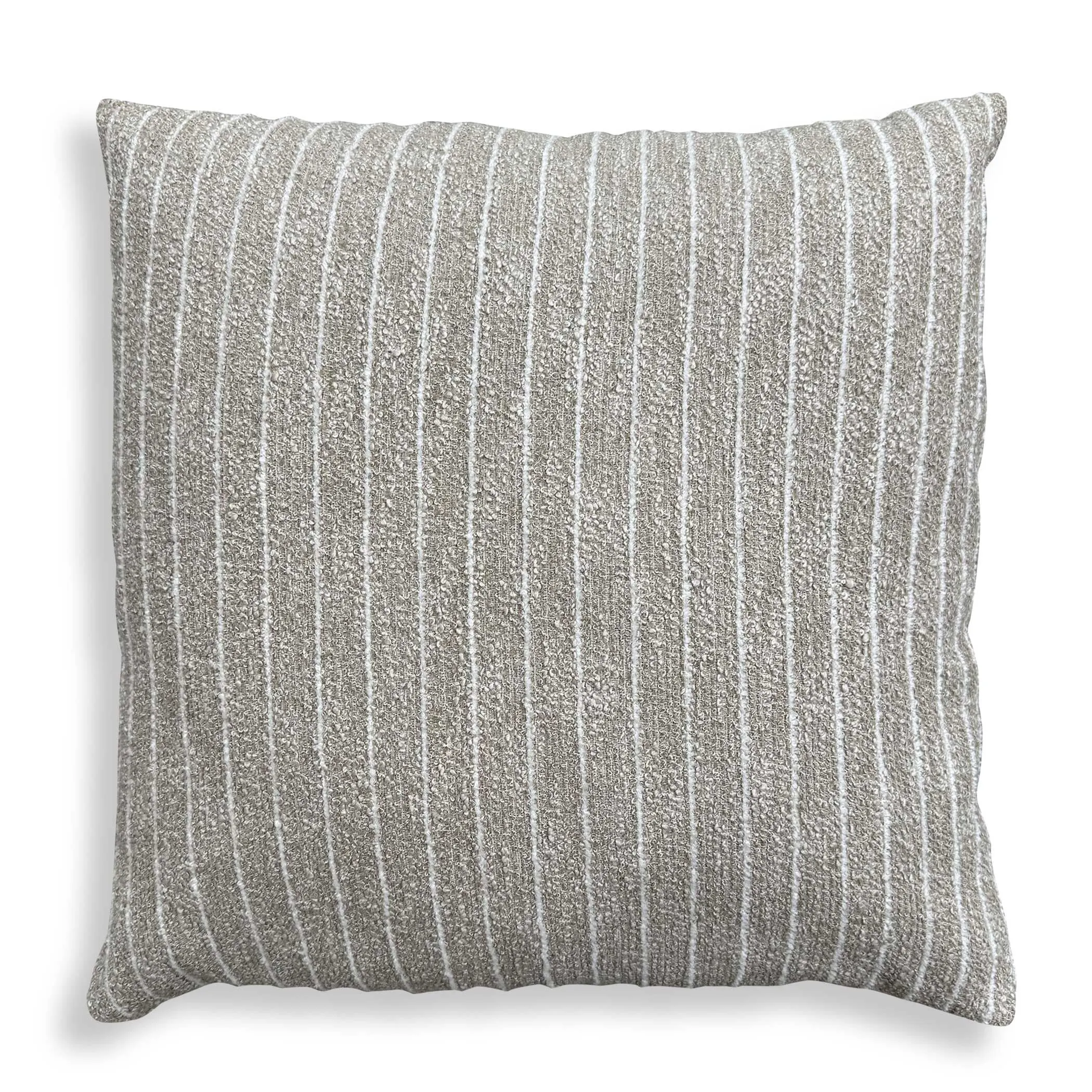 A Putty Boucle Ground Contrasts With A Refreshing Cream Stripe In Sunbrella Solution Dyed Acrylic. Complete With An Invisible Zipper And Filled With A Plush, Microdenier Polyester Inside A Water-resistant Casing. Made In The USA.