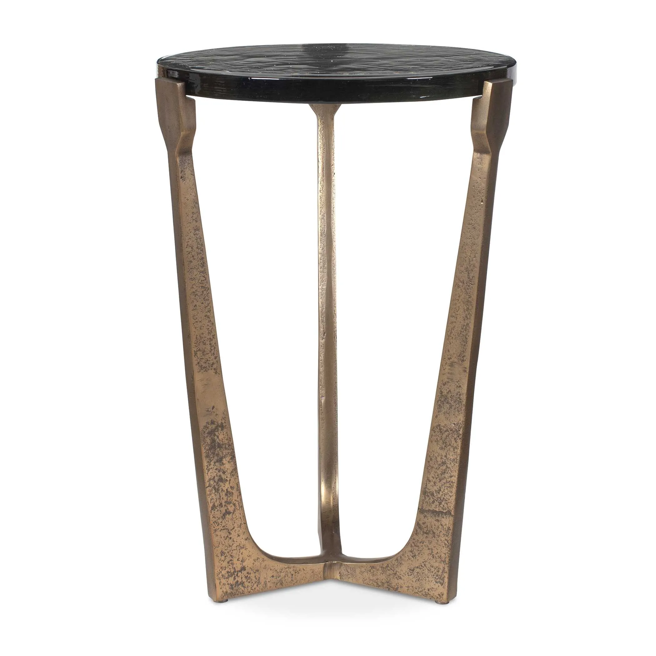 Crafted From A Combination Of Antique Brass Finished Cast Aluminum And Rich Cast Glass, This Accent Table Showcases Exquisite Craftsmanship. The Warm Tones Of The Brass Frame Complement The Unique Texture Of The Glass Top, Creating A Truly Captivating Piece. Suitable For Both Indoor And Outdoor Use.